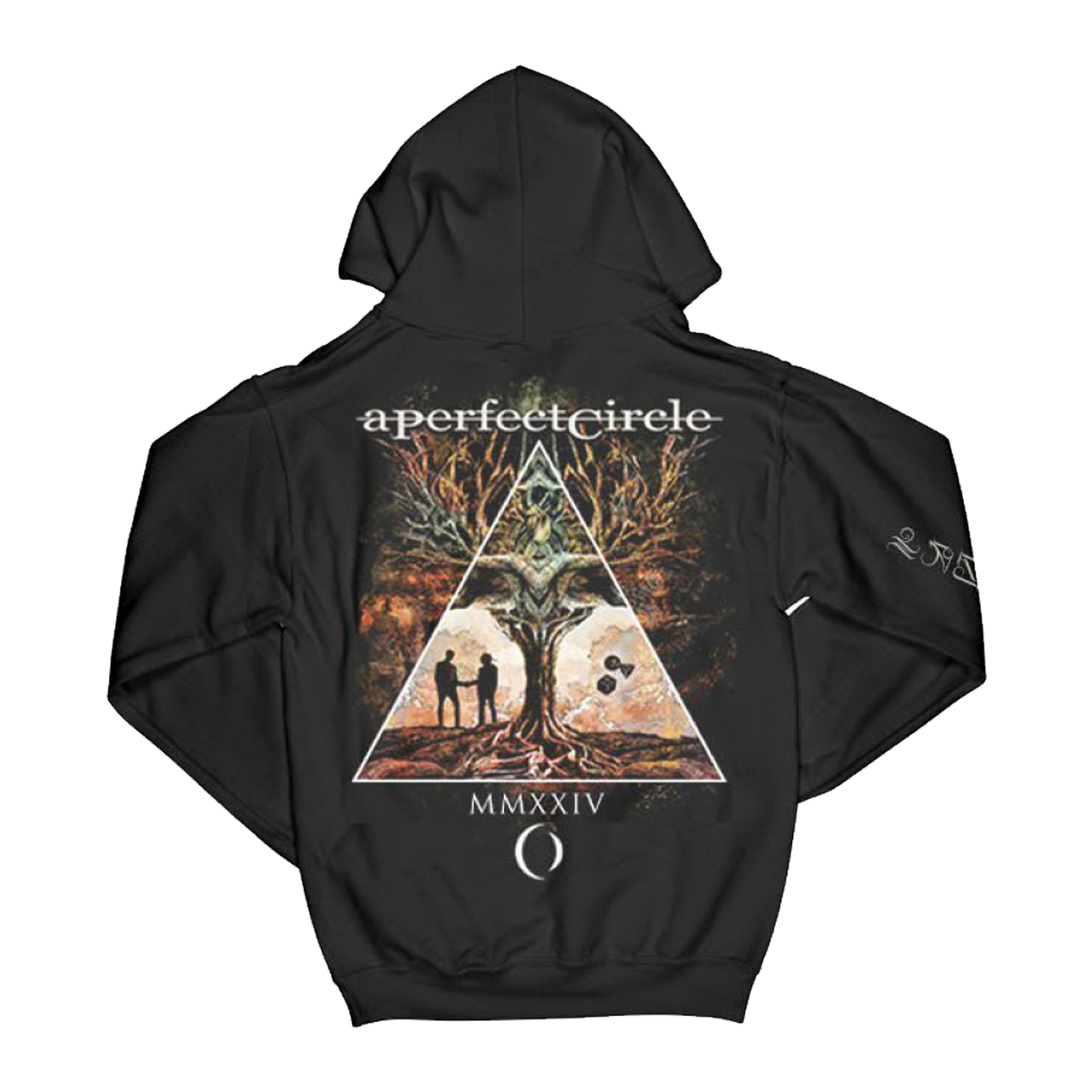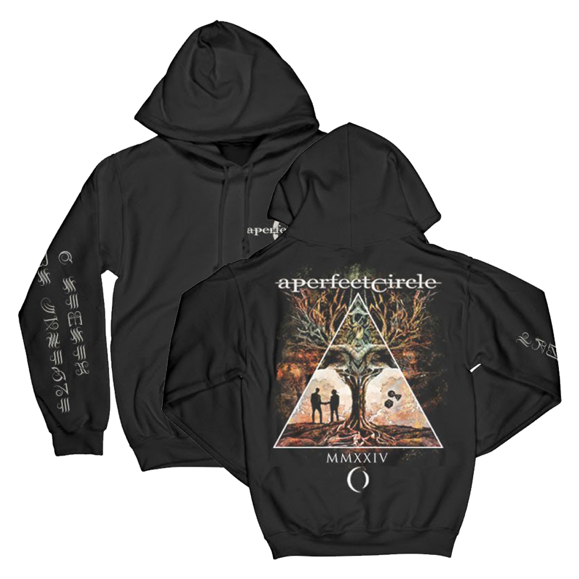 As part of the 2024 Tour Collection the “Yggdrasil Pullover Hoodie” from A Perfect Circle features the bands iconic logo on front left chest & the Norse tree of life design on back.